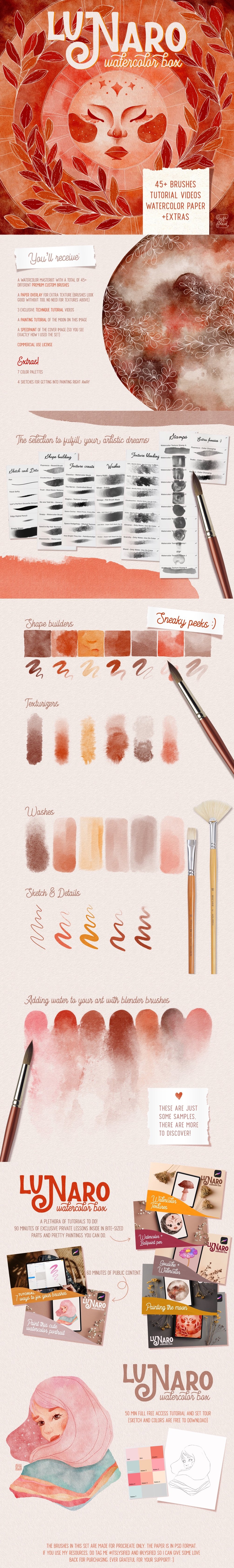 Lunaro is everything you'd need for a real traditional feel on your iPad while retaining usability as well. It's for anyone who is yearning to replicate translucent, beautiful lines and add authentic details like a boss to their art. Get your art be mistaken for real traditional watercolor paintings without the worry of using watercolors on paper. These brushes work like traditional watercolors and might seem overwhelming, but I got you: there's a total of 150 minutes of tutorials included (both publicly accessible and exclusive) so you can master the set in no time with painting together :)