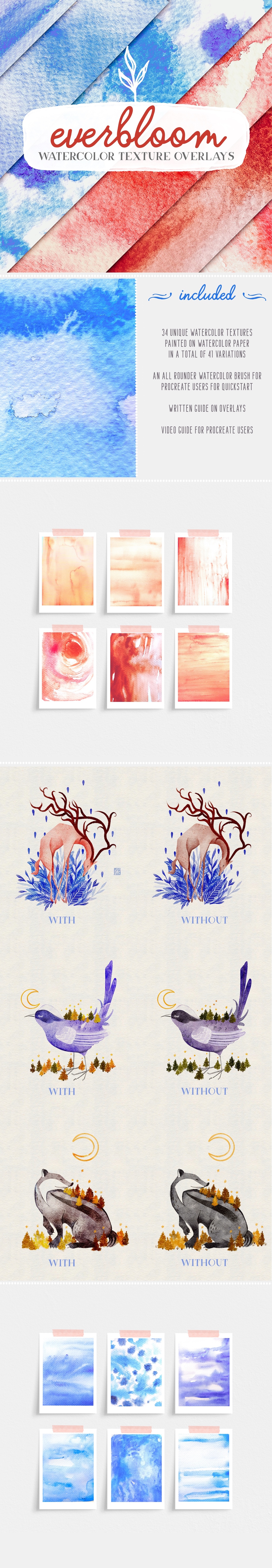 Everbloom watercolor texture overlays (+extra watercolor procreate brush and video guide)